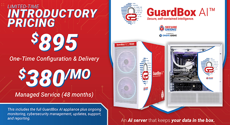 GuardBox AI includes the appliance plus ongoing monitoring, cybersecurity management, patching and updates, endpoint protection, access controls, and SecureUnions support.